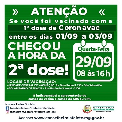 Aplicação da segunda dose para pessoas vacinadas com CoronaVac entre os dias 1 a 3 de setembro. É indispensável a apresentação do Cartão de Vacinação, Cartão Nacional do SUS ou CPF. Locais: