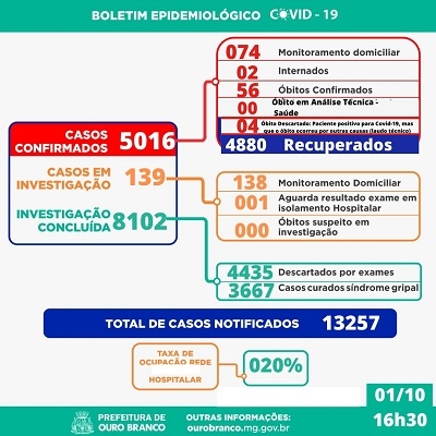 Nesta sexta-feira, 1º de outubro, Ouro Branco registrou 2 novos casos de Covid-19. A cidade detém, então, 5.016 quadros divulgados. Destes, 74 permanecem em monitoramento domiciliar, dois internados e 4.880 pessoas do munícipo já se recuperaram da doença. Desde o começo da pandemia, 56 óbitos foram confirmados.
