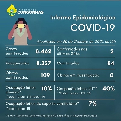 A Secretaria Municipal de Saúde de Congonhas divulgou nesta quarta-feira, 6 de outubro, 2 novos casos de Covid-19. A cidade totaliza, então, 8.462 pessoas infectadas desde o início da pandemia. Deste total, 8.327 pacientes já receberam alta. Outros 84 estão em monitoramento.
