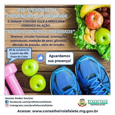 A Secretaria de Saúde, por meio do EMMAP, convida os lafaietenses para uma ação social na praça do Cristo no próximo sábado, 9 de outubro, em referência do Dia Nacional de Prevenção da Obesidade. As atividades aocntecem a partir das 8h.