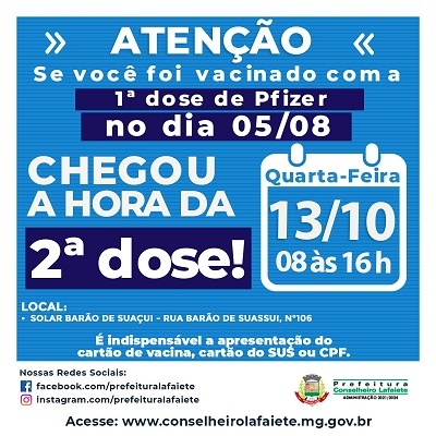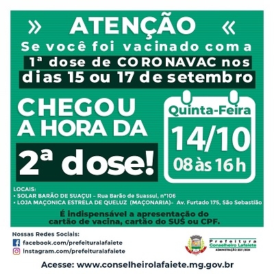 Confira o calendário de aplicação da segunda dose da vacina contra a Covid-19 para esta semana, divulgado pela Secretaria de Saúde de Lafaiete. Para se imunizar, é obrigatorio apresnetar o cartão de vacina, cartão do SUS ou CPF.