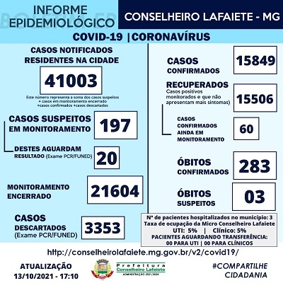 A Secretaria Municipal de Saúde e o Serviço de Epidemiologia confirmam oito novos casos de Covid-19 em Conselheiro Lafaiete, nesta quarta-feira, 13 de outubro. Ao todo, são 15.849 registros de infecções pelo Coronavírus, sendo 15.506 recuperados e 197 quadros suspeitos em monitoramento. São 283 vítimas fatais das complicações da doença. Três óbitos estão em análise.