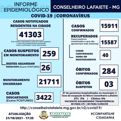 A Secretaria Municipal de Saúde e o Serviço de Epidemiologia confirmou três novos casos de Covid-19 em Conselheiro Lafaiete, nesta quinta-feira, 21 de outubro. Ao todo, são 15.911 registros de infecções pelo Coronavírus, sendo 15.587 recuperados e 40 quadros suspeitos em monitoramento. São 284 vítimas fatais das complicações da doença. Três óbitos estão em análise.