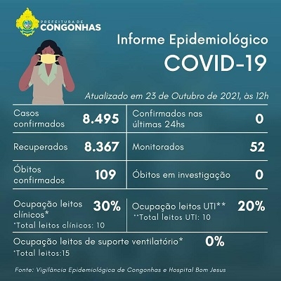 A Secretaria Municipal de Saúde informa que, até às 12h deste sábado, dia 23 de outubro de 2021, 8.495 casos de Covid-19 haviam sido confirmados em Congonhas. Deste total, 8.367 pacientes já receberam alta. Zero novos casos foram confirmados nas últimas 24 horas e estão sendo monitorados 52 casos da doença.