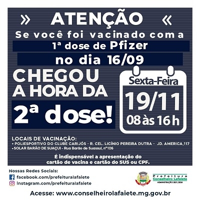 Já no sábado, 20 de novembro, é a vez dos vacinados com Pfizer no dia 17 de setembro receberem a segunda dose do imunizante de 8h às 14h. Confira os locais de aplicação: