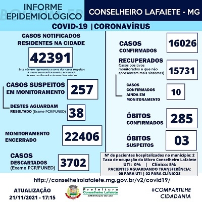 Neste domingo, 21 de novembro, foi confirmado um novo caso de Covid-19 em Lafaiete. A cidade possui 16.026 casos positivos, 15.731 recuperados e 10 pessoas em monitoramento. A taxa de ocupação dos leitos clínicos está em 5% e a de leitos clínicos está zerada. Dois pacientes aguardam transferência para leitos clínicos. Os pacientes que não necessitam de internação seguem em monitoramento e isolamento domiciliar.