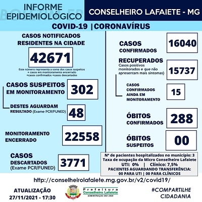 A ocupação dos leitos em Lafaiete neste sábado, 27/11, está em 7,5% em leitos clínicos. Os pacientes que não necessitam de internação seguem em monitoramento e isolamento domiciliar.