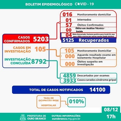 Nesta quarta-feira, 8 de dezembro, a Secretaria de Saúde de Ouro Branco confirmou dois novos casos de Covid-19. Assim, o município totaliza 5.203 casos confirmados, sendo 16 em monitoramento e um internado.