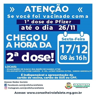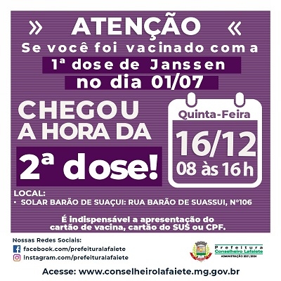 A Secretaria de Saúde de Lafaiete informa que nesta quinta-feira, 16 de dezembro, vacinados com a primeira dose de Janssen em 1º de julho poderão receber a segunda dose do imunizante. A aplicação ocorre de 8h às 16h no Solar Barão de Suaçui, na Rua Barão de Suassui, n°106.