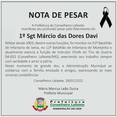 Dois militares que prestaram serviços em Lafaiete faleceram nesta quinta e sexta-feira, dias 27 e 28 de janeiro. O sargento do Exército, Márcio das Dores Davi, de 41 anos, morreu em um acidente registrado na BR-494, em Oliveira, na quinta-feira. Sargento Davi era instrutor do Tiro de Guerra na cidade.