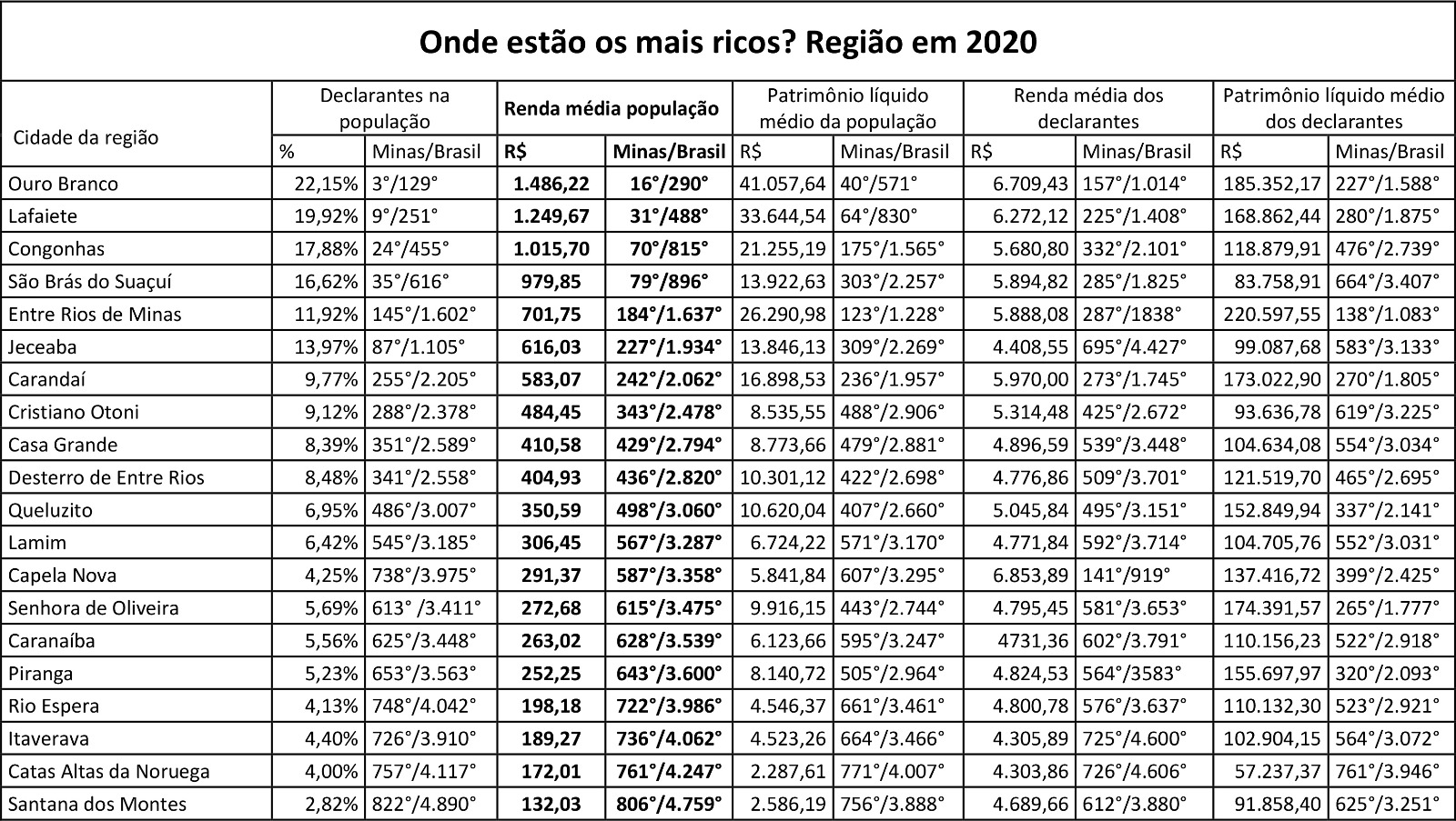 O ranking completo, com informações de todos os 853 municípios mineiros, está disponível no site do Mapa da Riqueza, do FGV Social. Os dados também consideram qual é a renda média de quem declara o Imposto de Renda e o patrimônio líquido da população. A maior renda de declarantes do Estado também é de Nova Lima, de R$ 27.017. No Brasil, ela só perde para a dos declarantes da região administrativa do DF Lago Sul, em que chega a R$ 39.535. Na região, ela espelha a desigualdade. Segunda colocada em renda de declarantes, Ouro Branco (R$6.709,43) perde a ponta para Capela Nova – cidade com a oitava pior renda média da região entre a população em geral (R$291,37), onde apenas 4,25% dos habitantes declaram imposto de renda – ou seja, têm renda superior a 2mil. Mas a média entre esses habitantes de melhor posição social deixa as demais cidades do entorno no chinelo: R$6.853,89.