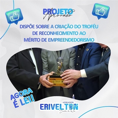 Agora é lei! O município de Lafaiete irá reconhecer a atuação de empreendedores – sejam eles de micro ou grande porte. A ideia partiu do vereador Erivelton Jayme (Sonho de Rua), que apresentou um projeto propondo a criação do troféu de reconhecimento ao mérito de empreendedorismo. De acordo com o vereador, “o objetivo é homenagear todos aqueles empreendedores que, de alguma forma, destacaram-se positivamente dentro do cenário da nossa cidade, onde a maior parte da sua economia é movida pelo comércio. O troféu leva o nome de "José Milton de Carvalho Rocha", uma homenagem a um grande empreendedor lafaietense, além de um político ativo na nossa cidade, que faleceu no ano de 2021”, explica.