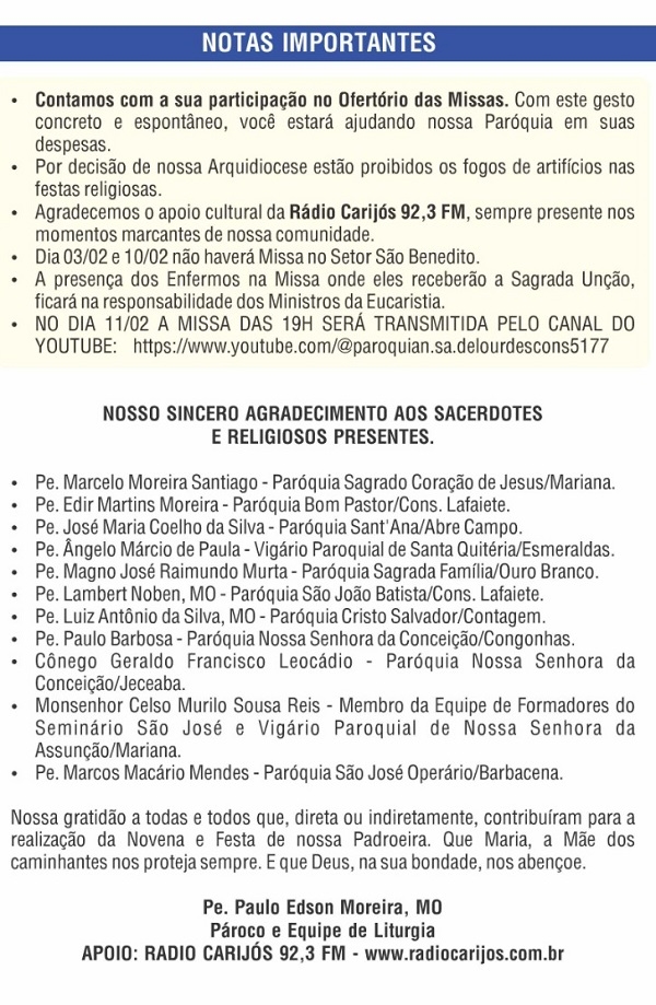 Entre os dias 2 a 11 de fevereiro, os devotos de Nossa Senhora de Lourdes vão vivenciar um momento de espiritualidade com a realização da Novena em honra à santa. Todos os dias, haverá a celebração eucarística e contará com participações especiais de grupos católicos. Confira a programação completa: