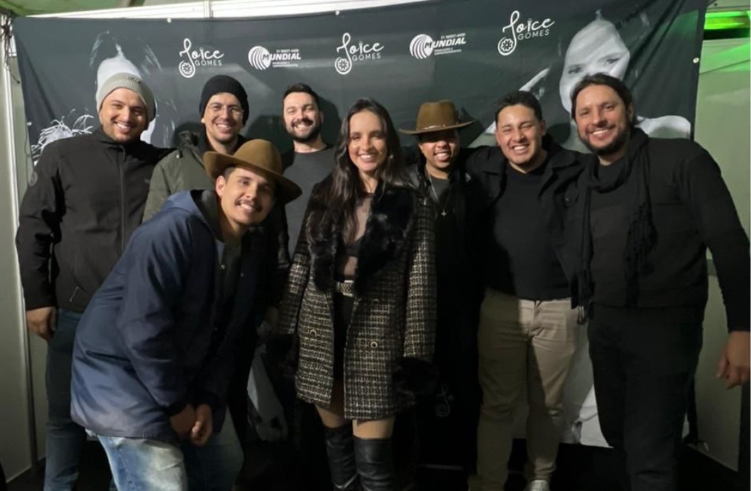 Equipe da cantora Joice Gomes posa para foto antes do show em Capela Nova