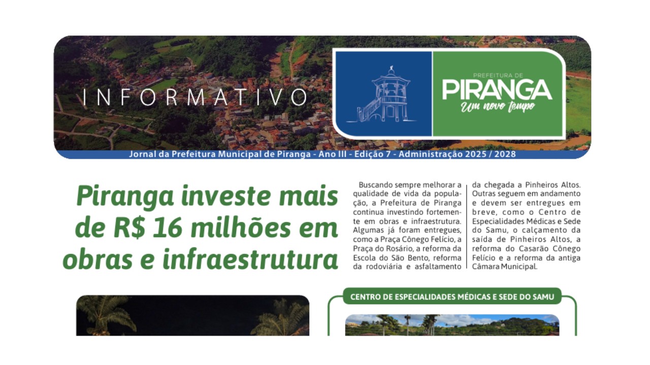 A Prefeitura de Piranga acaba de lançar o seu 7º Informativo Oficial, em uma iniciativa que aproxima a administração pública da população e registra as principais ações e conquistas do município. O informativo destaca os resultados da gestão com transparência, organização e impacto visual, reunindo projetos, serviços e iniciativas que beneficiam diretamente os cidadãos.