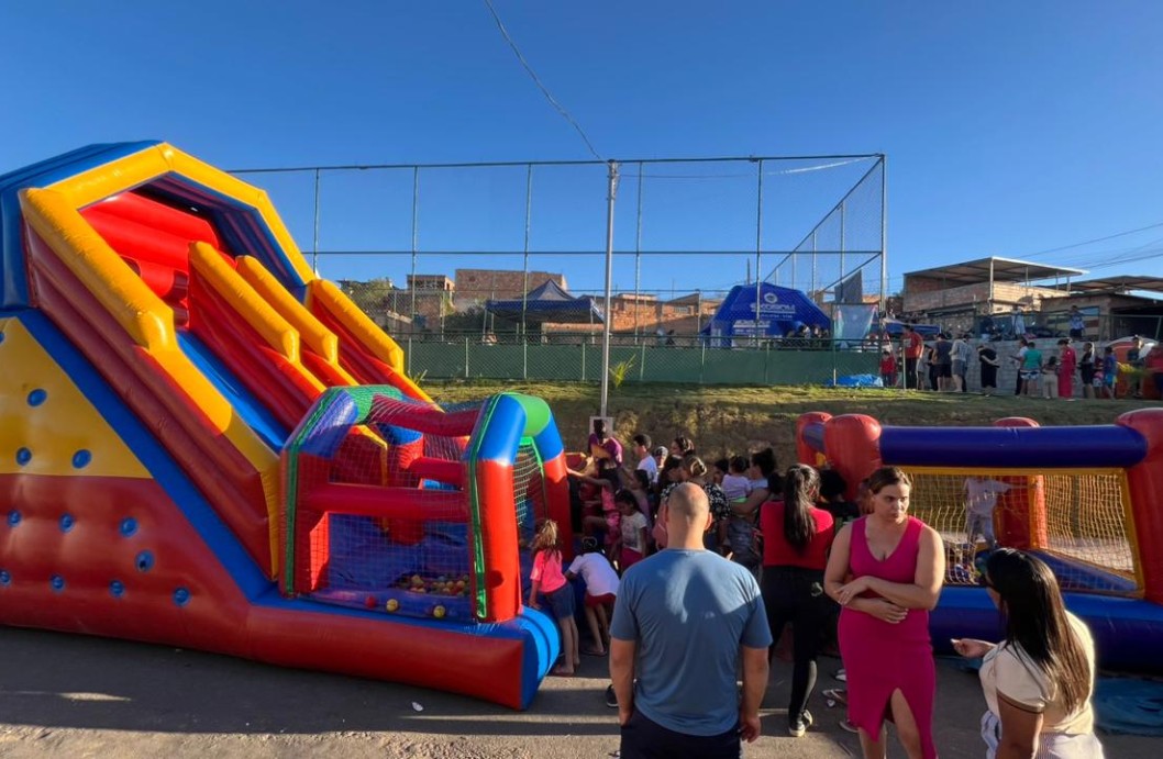 As atrações incluem brinquedos infláveis para as crianças, pipoca e algodão-doce, apresentações artísticas e diversas brincadeiras