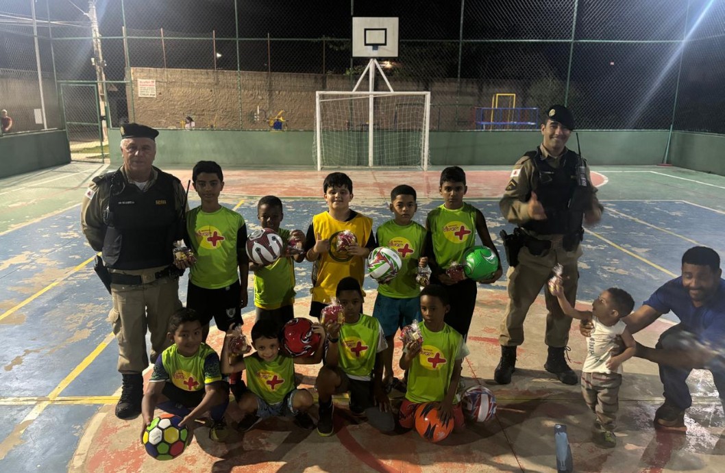 Durante a iniciativa, foram entregues bolas, coletes, petecas e balas às crianças que participam do projeto esportivo local, incentivando o lazer, o convívio social e a prática esportiva. A ação foi conduzida pelos militares Subtenente Alberto e Soldado Oliveira, da Viatura 32497, reforçando o compromisso da corporação com a comunidade e o desenvolvimento social de jovens e crianças da cidade.