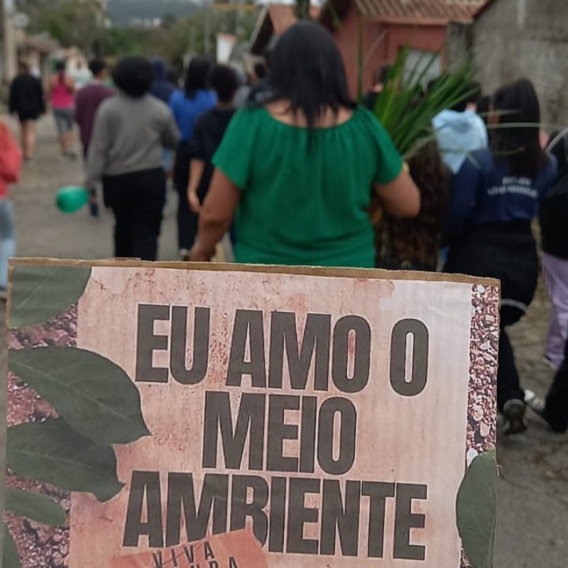 O grupo saiu do PSF e seguiu até a pracinha do bairro, vestindo roupas verdes, com balões e plaquinhas que incentivavam o cuidado com a natureza