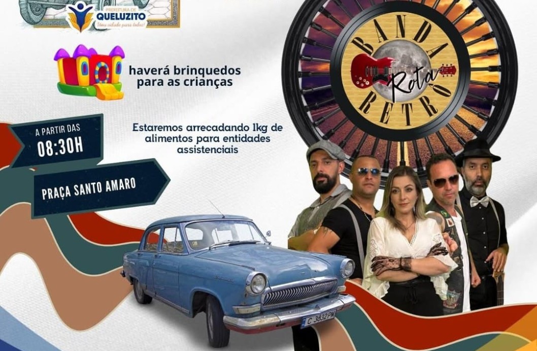 A programação inclui show da Banda Rota Retrô, às 14h, trazendo clássicos que marcaram época e vão animar o público durante toda a tarde. O encontro também contará com brinquedos para as crianças, garantindo diversão para toda a família. Como parte da iniciativa solidária do evento, os participantes são convidados a contribuir com 1 kg de alimento não perecível, que será destinado a entidades assistenciais do município. A realização é da Prefeitura Municipal de Queluzito.