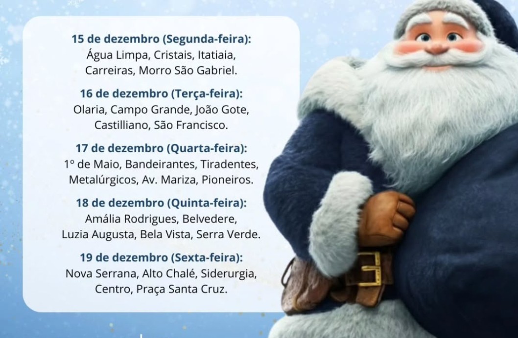 Ao longo da semana, o bom velhinho visitará bairros de Ouro Branco, promovendo momentos de interação com as crianças, além de fotos, brincadeiras e conversas com as famílias. A ação busca tornar o Natal ainda mais especial, especialmente para os pequenos.Durante as visitas, a GCMOB fará a distribuição de kits com balas e guloseimas, reforçando o caráter solidário da iniciativa. A proposta é proporcionar momentos simples, porém marcantes, fortalecendo laços e promovendo acolhimento nas comunidades atendidas.