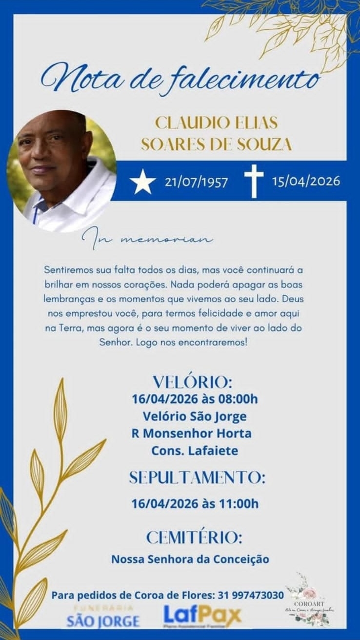 O velório de Cláudio Elias Soares de Souza será realizado nesta quinta-feira, dia 16, a partir das 8h, no Velório São Jorge, em Conselheiro Lafaiete.O sepultamento está marcado para as 11h, no Cemitério Nossa Senhora da Conceição.