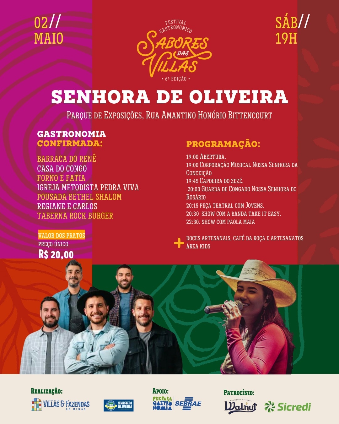 No sábado, a cidade de Senhora de Oliveira recebe o festival a partir das 19h, no Parque de Exposições. O público poderá saborear pratos exclusivos preparados por empreendedores locais, todos com preço único de R$ 20, além de aproveitar uma programação diversificada que valoriza a cultura tradicional. A noite contará com apresentações da Corporação Musical Nossa Senhora da Conceição, capoeira, congada, teatro e shows musicais, incluindo a banda Take It Easy e a cantora Paola Maia.